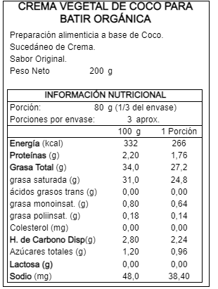 Ingredientes: Coco* (97%), azúcar de caña*, goma guar, goma xantana. (*) Ingredientes procedentes de la agricultura orgánica.